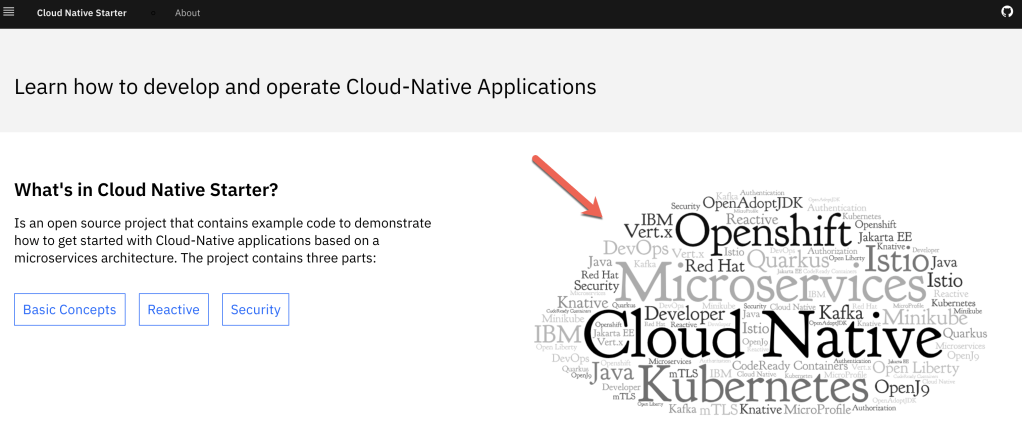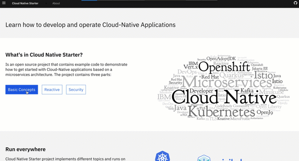 - First, the page content changes when a button is clicked. The page shows a little pre-view of content for one of the selected topics on the Cloud Native Starter project landing page. The topics are “Basic Concepts”, “Reactive” and “Security”.