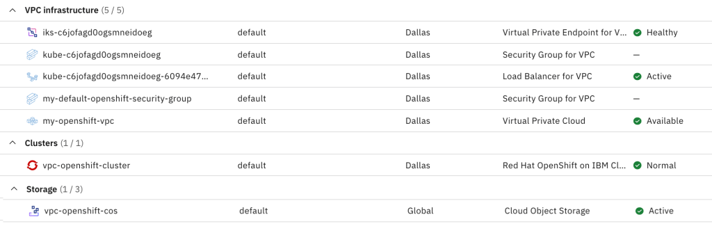 By default, the script creates the vpc resources and cluster in the Dallas region and uses the default resource group as you can verify in the image above. The cloud object storage is set up globally and is also a part of the resource group default. The elements within the diagram that contain the information cluster created are those resources that are automatically created when the cluster is created. Not visible in VPC only means that you can’t access the virtual server instances (VSI) for the worker nodes, but you can see them in the IBM Cloud web UI for the cluster itself.