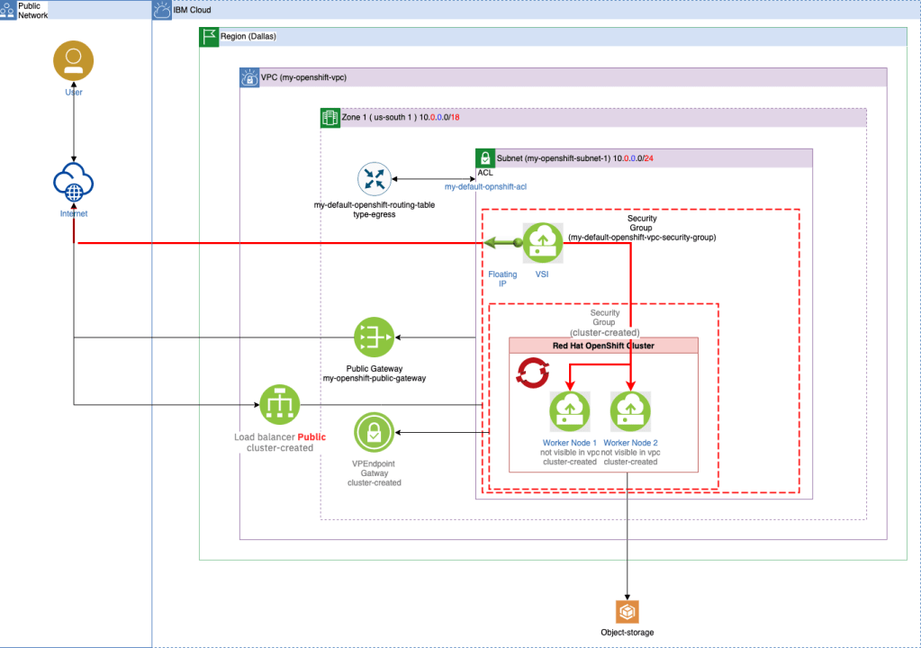 The lines marked in red show the call sequence from the end point in the Internet with the floating IP address of the VSI to the running application within the OpenShift cluster.