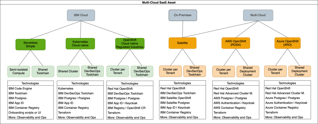 The following diagram shows the different deployment platform options, currently including several alternatives for IBM Cloud, as indicated by the green boxes. The orange boxes represent planned future developments, including the addition of IBM Cloud Satellite which will allow the SaaS application to be deployed on-premises at client data centers, while still taking advantage of an OpenShift cluster managed by IBM Cloud. Additionally, the same SaaS application could be deployed to other managed OpenShift services like AWS ROSA and Azure ARO.
