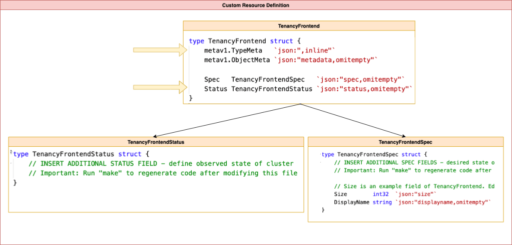 TenancyFrontendcontains meta definitions for theCustom Resource Definitionfor the Operator and links to own defined sections (for example the sections “spec” and “status” are predefined when you create a GO project with the Operator SDK)- The following code example is an extract of the