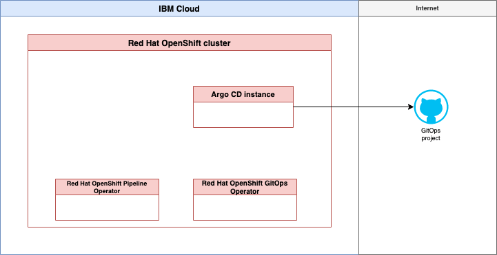 In that scenario we will use IBM Cloud with a Virtual Private Cloud and a Red Hat OpenShift cluster with Argo CD installed and integrated with a GitHub project.