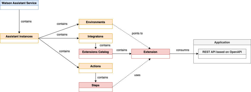 The following diagram displays the simplified architecture dependencies inside a Watson Assistant Service. We will integrate a custom extension to an assistant instance in the examples.