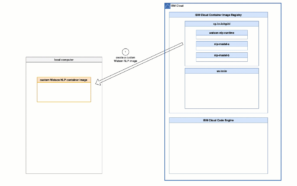 The next gif shows a simplified overview of the dependencies and steps we need to execute when we using IBM Cloud Code Engine to run a custom Watson NLP runtime container. You can find the detailed instructions in the official IBM documentation installing running containers.