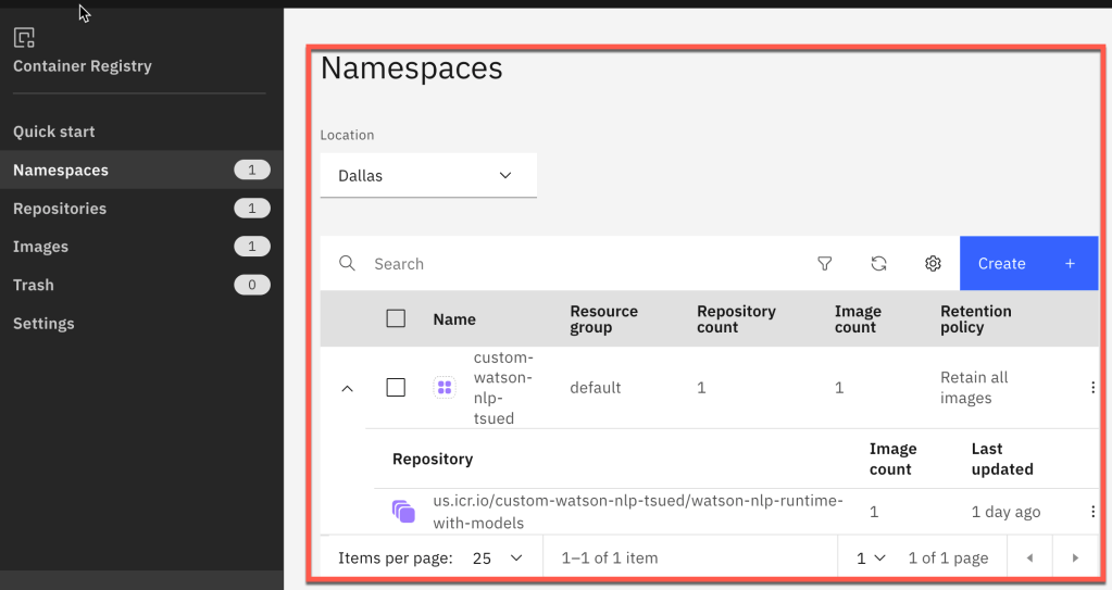 - We use the IBM Cloud Container Registry to save and protect our custom container image. In the container image registry we create a namespace where we upload the image. The namespace name must be unique in the IBM Cloud region of the container registry.