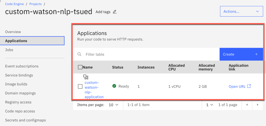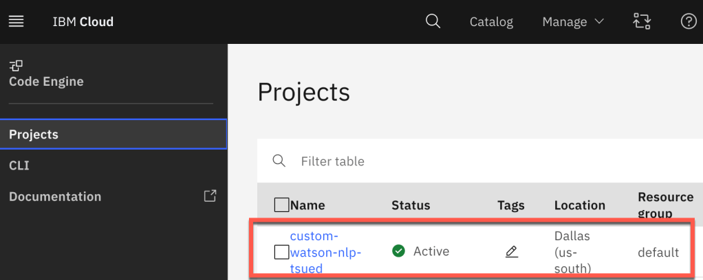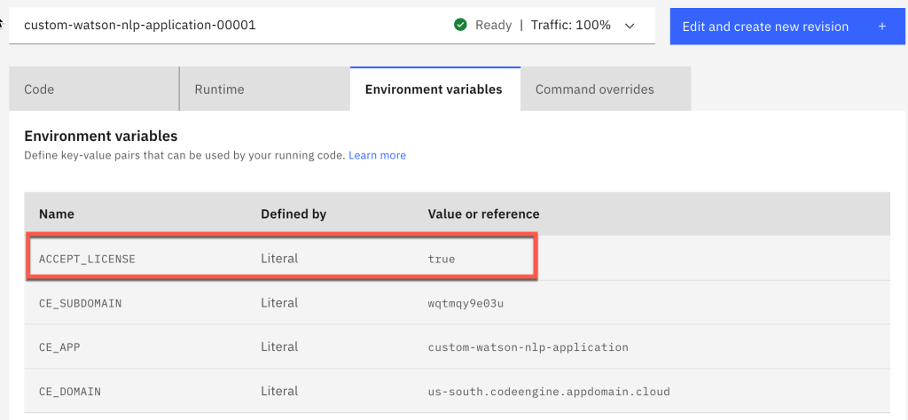 Set CE_APPLICATION_NAME URL: https://custom-watson-nlp-application.wqtmqy9e03u.us-south.codeengine.appdomain.cloud