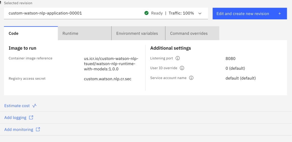 Run 'ibmcloud ce application get -n custom-watson-nlp-application' to check the application status.