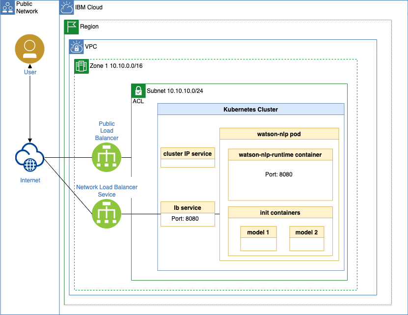 The next image below shows a simplified overview of the dependencies of the running Watson NLP pod on the Kubernetes cluster. Which is a bit different from the detailed instructions in the official IBM documentation Run with Kubernetes. The difference is that it contains an additional Kubernetes load balancer service configuration for an IBM Cloud VPC.