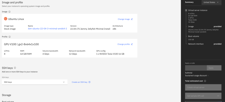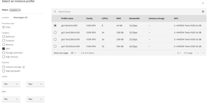 With a Virtual Server Instance (VSI), you only pay per usage and don’t have an upfront cost. It is available in minutes (when a GPU is available ;-), ideal for testing or short-term usage.