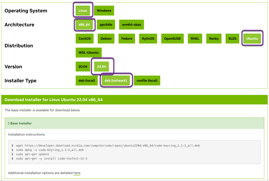 For NVIDIA follow the installation instructions The image below shows an example of a possible selection for an installation.