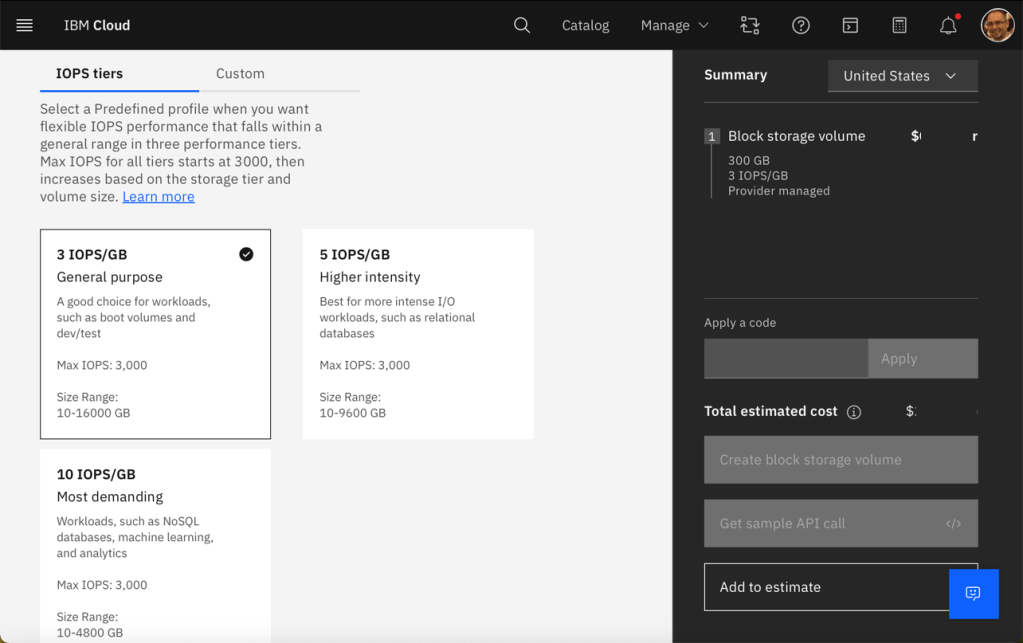 Info about the IBM Cloud Block Storage: “local disk performance with SAN persistence and durability. Increase storage capacity available to your IBM Cloud Virtual Servers with a maximum of 48k IOPS. Deploy flash-backed block storage volumes from 20GB to 16TB–and customize it all with a variety of capabilities.