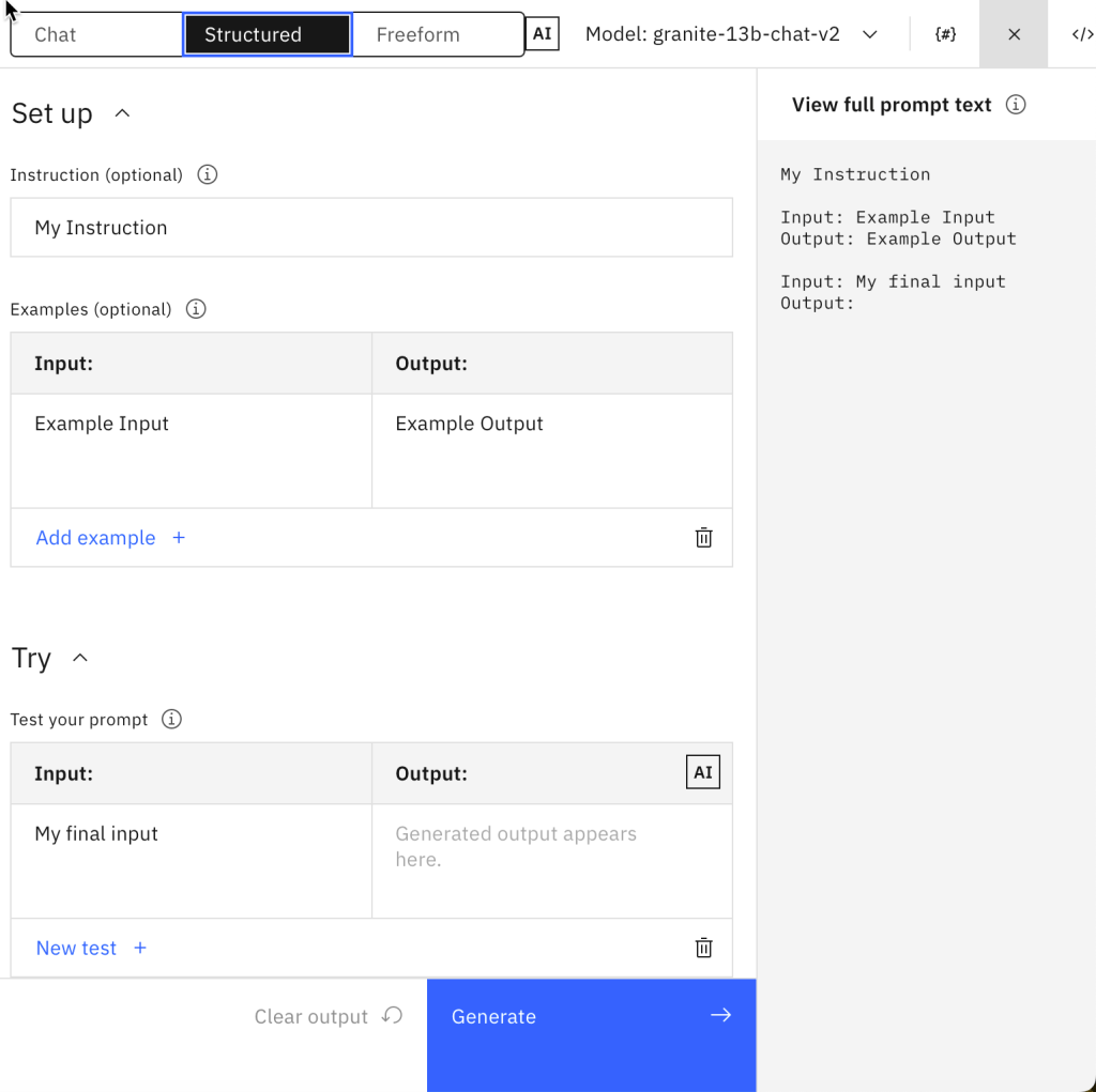 | Structured | Help, you to pre-structure your prompt easily in: Instructions, Example Inputs, and the final input |