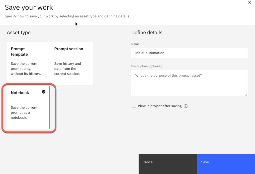 The watsonx.ai Prompt Lab allows us to turn manual prompt execution into initial automation using Jupyter Notebooks.