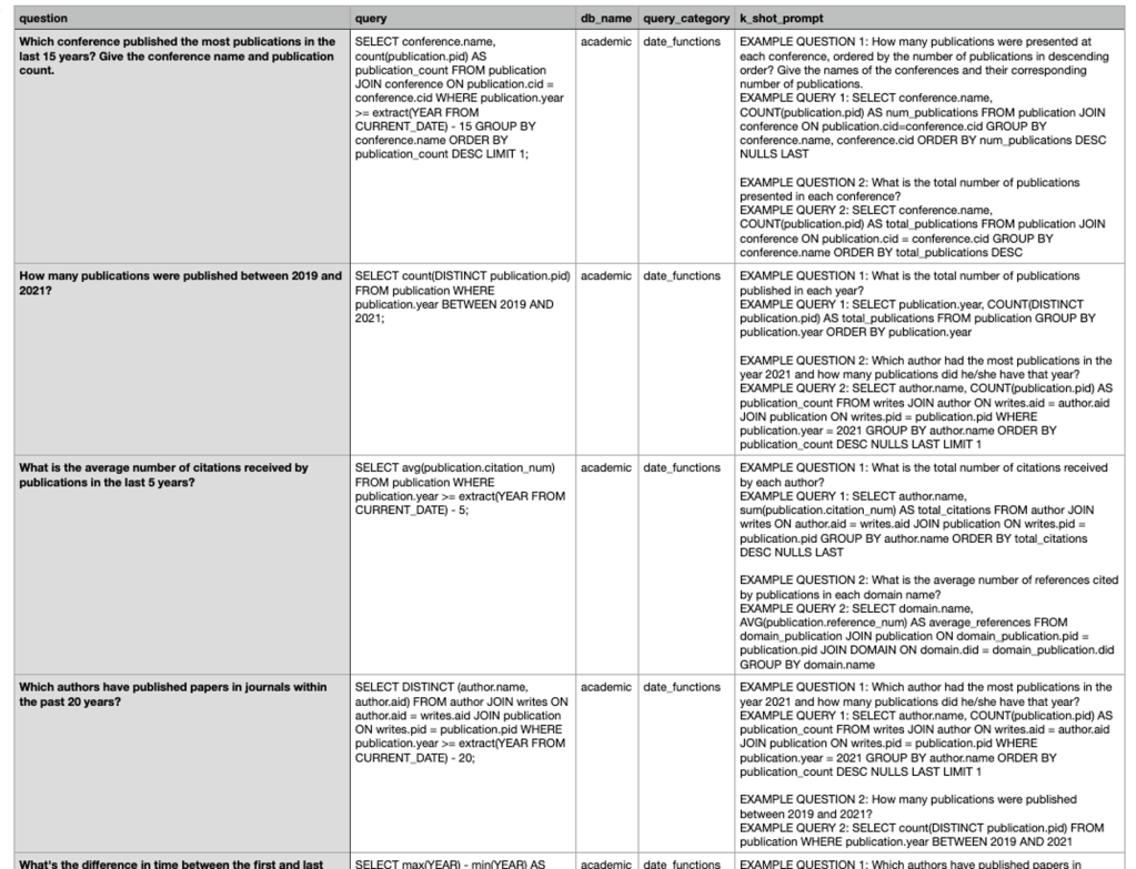 Example “golden” ground truth testing data from Defog data repository for Text to SQL test.