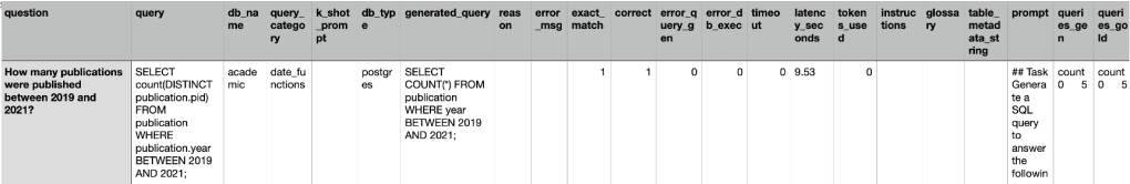 Example extract for a test run with the Defog eval framework for Text to SQL.