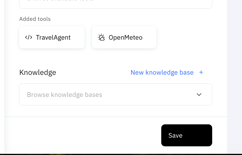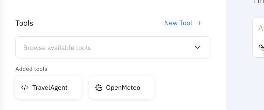 TravelAgentToolto the UI system schema in the src/app/api/schema.d.ts fileFor the newer Bee – UI version 2024.12.18 you need to search for “web_search” | “wikipedia” | “weather” | “arxiv” | “read_file” | “llm” | “calculator” changes which works with the Pull Request.