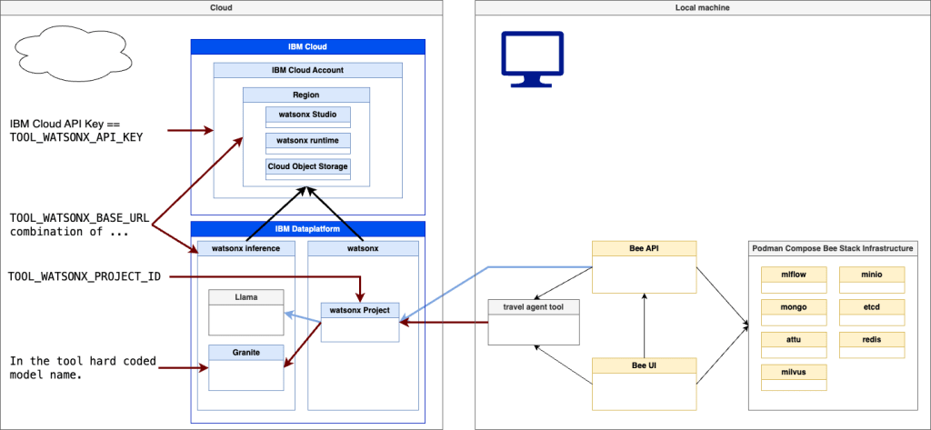 Add additional entries to the environment variables for the Bee API in the file bee-api/.env because we need additional variables in the TravelAgentTool to ensure we are independent of the Bee Agent model configuration. We need to reflect this in the environment variables when we maybe using various watsonx projects and IBM Cloud Account for the tool and the Bee Agent.
