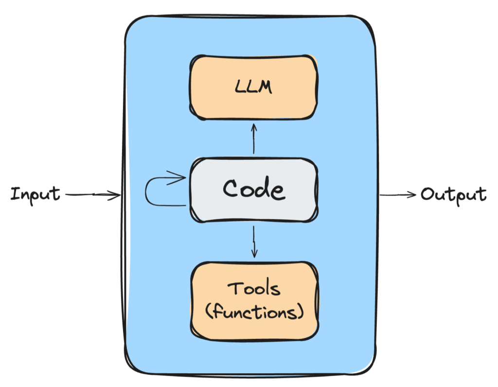 The image below illustrates how the agent program works. We have an input and an output. In the middle, there is the combination of code, a large language model, and tools (small programs 😉 also).