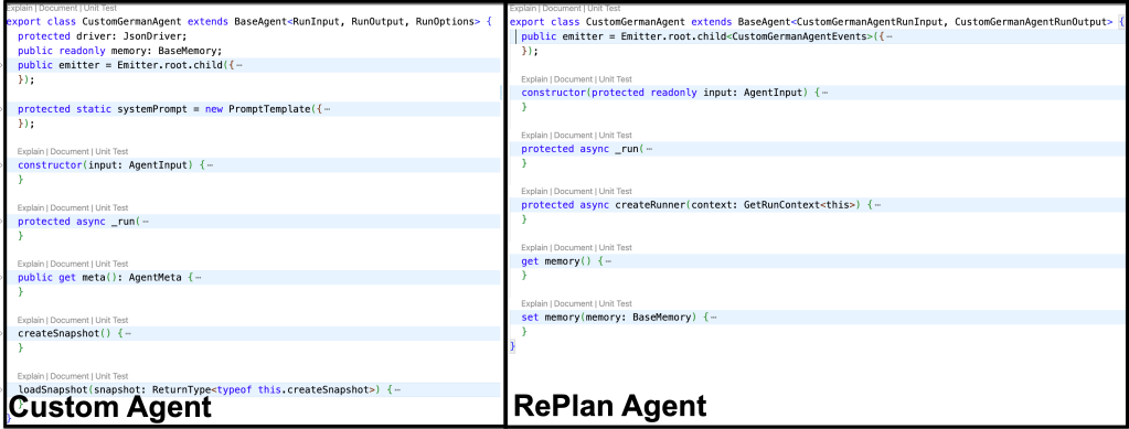 The following image contains the two CustomGermanAgent Classes we define in the example based on the Custom Agent and RePlan Agent examples. The objective is not to cover all the differences. It is only that you get the impression that you can see the common methods and variables.