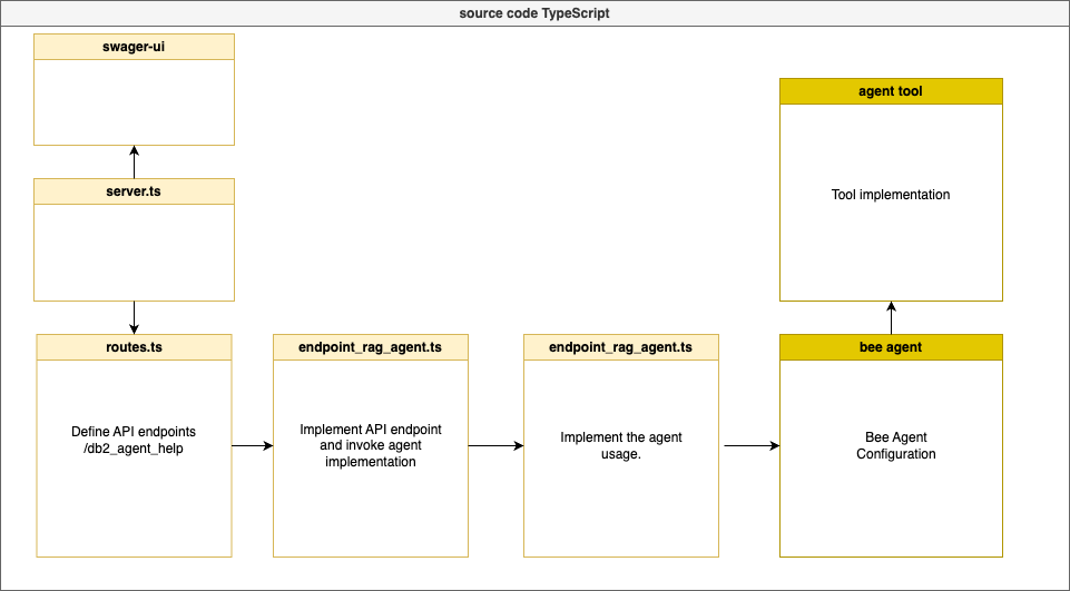 The image below shows the simplified TypeScript backend server code dependencies. Here, we replace the rag_agent with the agent implementation of our custom. We will not add an additional agent tool implementation because our Agent uses the public system tool of the Bee Agent Framework. This example is a part of the GitHub repository watsonx.ai platform demos.