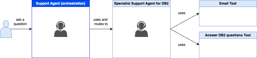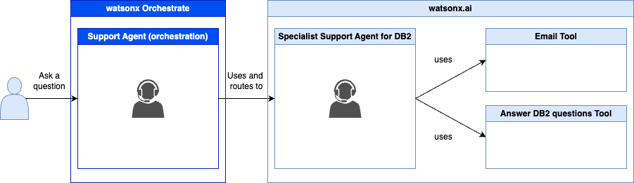 The image below simplifies technical dependencies based on the last blog post and the workshop documentation for the Specialist Support Agent for DB2 and the new orchestration agent we will create in watsonx Orchestrate.
