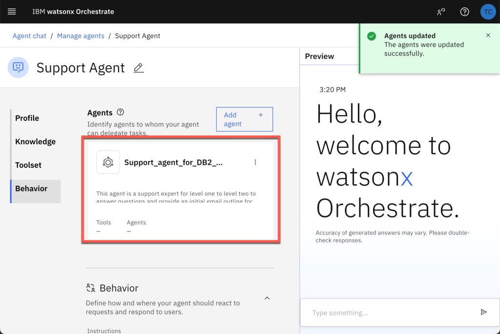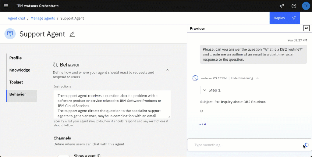We can say this agent is a support expert for level one to level two to answer questions and provide an initial email outline for support members to be more effective. This agent can find the answers to complex questions by accessing DB2 documentation. If you request an outline for an email to send to a customer, it can outline this.
