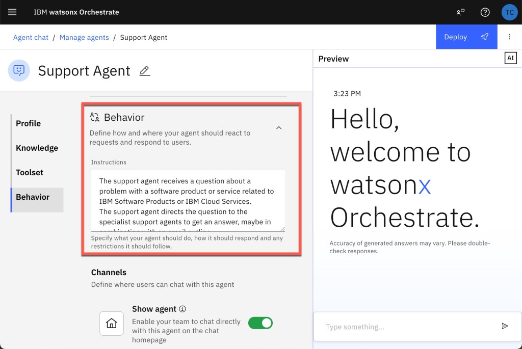 With watsonx Orchestrate, you can combine multiple specialist agents to create an orchestrator support agent which: