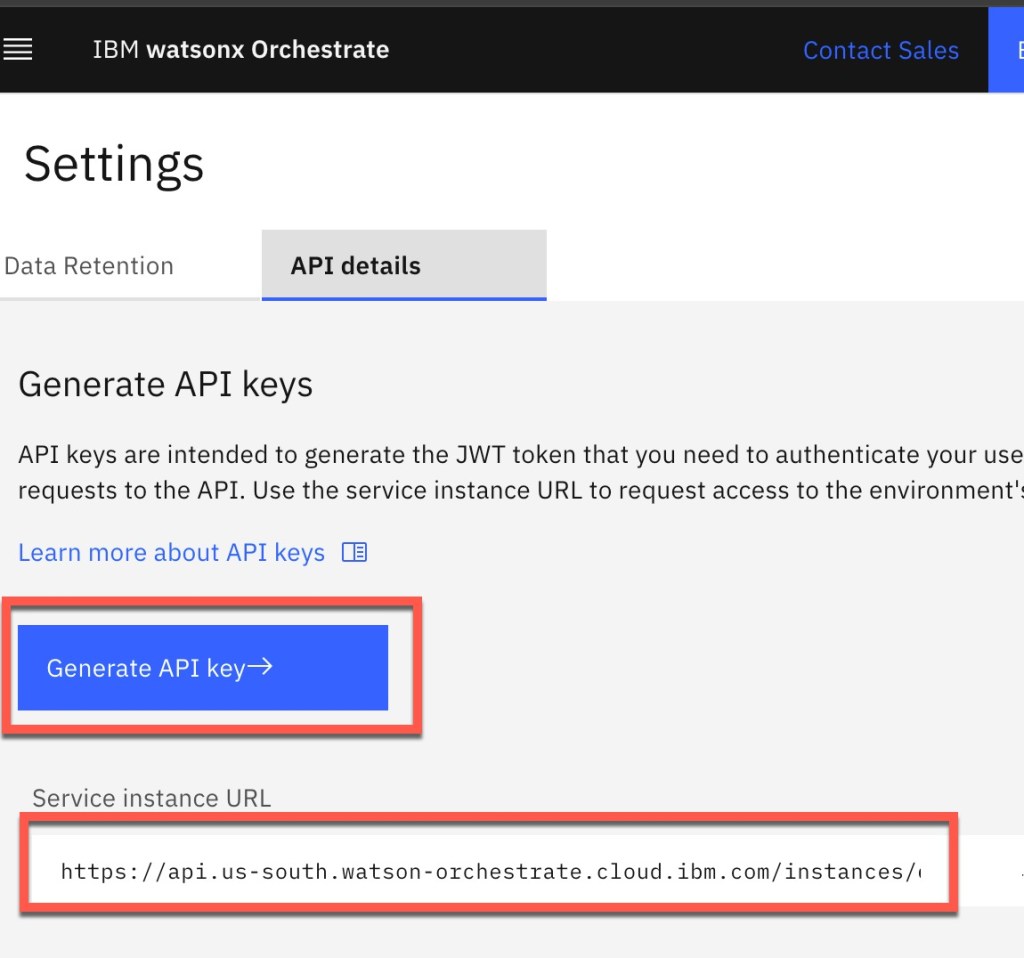 You get the Orchestrate Service instance URL and the IBM Cloud API key in “Profile/Settings” information of the watsonx Orchestrate instance on IBM Cloud: