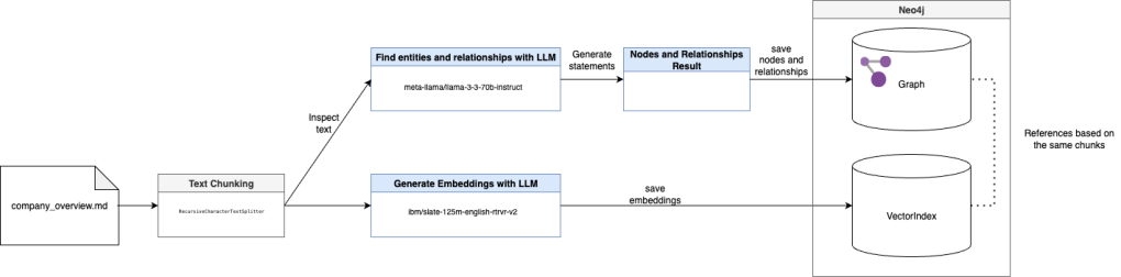 - The data is stored in Neo4j and enhanced with embeddings for semantic search.