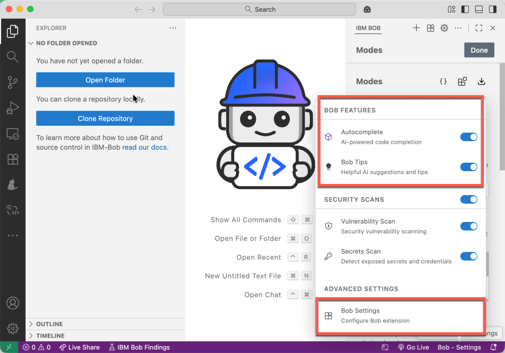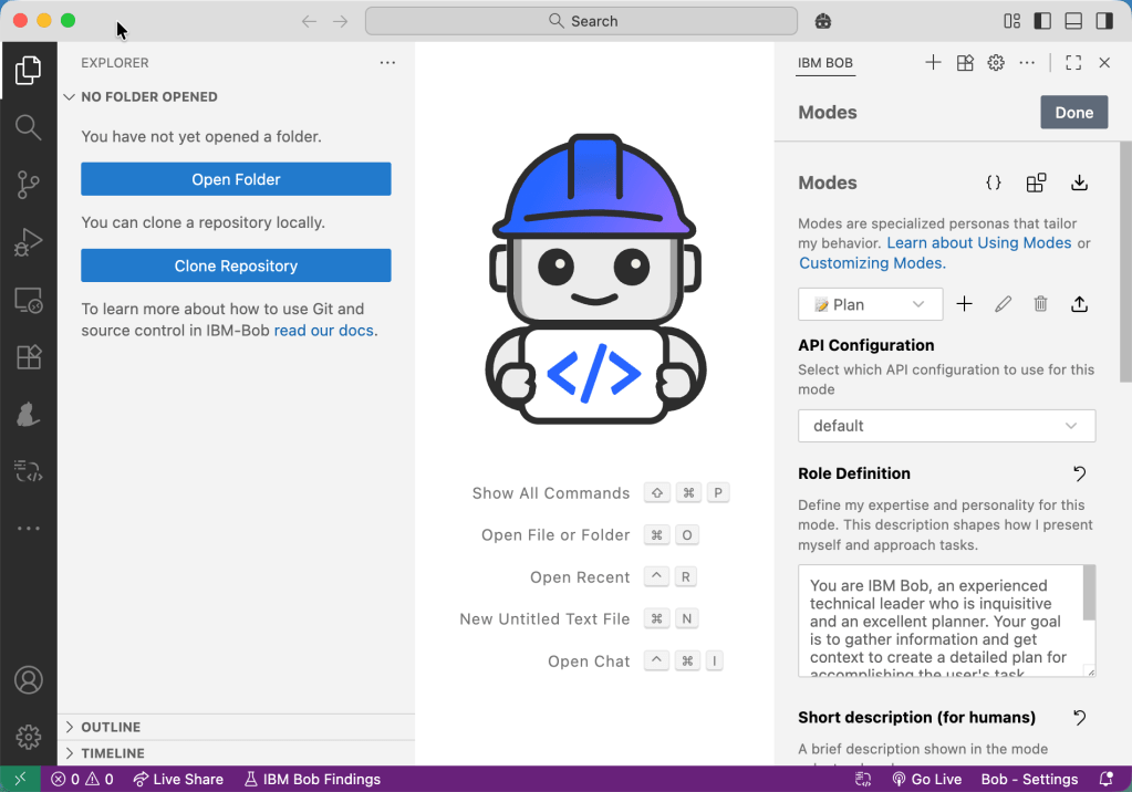 I noticed that IBM Bob provides configurable Modes: “Modes are specialized personas that tailor Bob’s behavior for your specific tasks. Each mode offers different capabilities and access levels to help you accomplish particular goals more efficiently.”