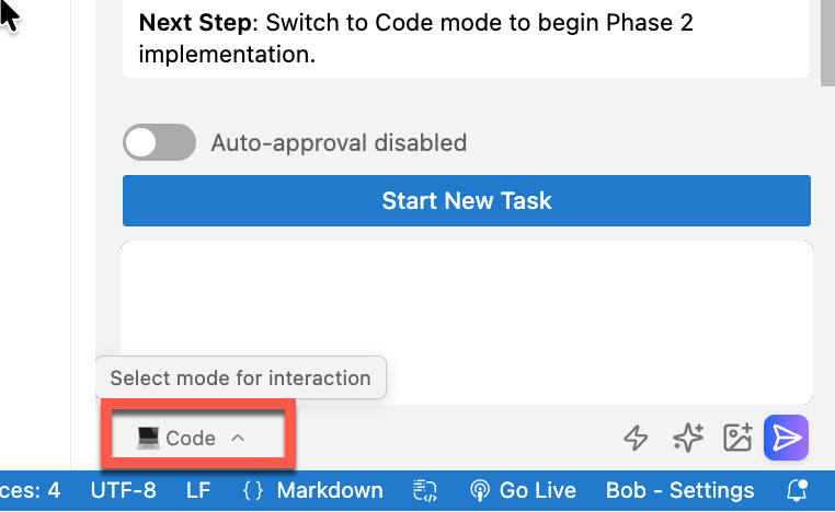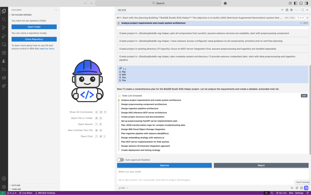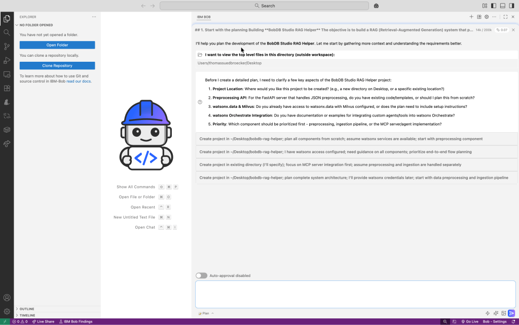 Then Bob generates the initial plan. I had switched off auto-approve because I wanted to verify each generation step and understand what Bob generated.