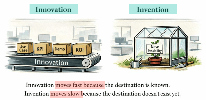Because it feels like we’re optimizing everything around innovation (outcomes, adoption, monetization) — while slowly losing the muscle for invention (new technical possibilities, curiosity-driven exploration).