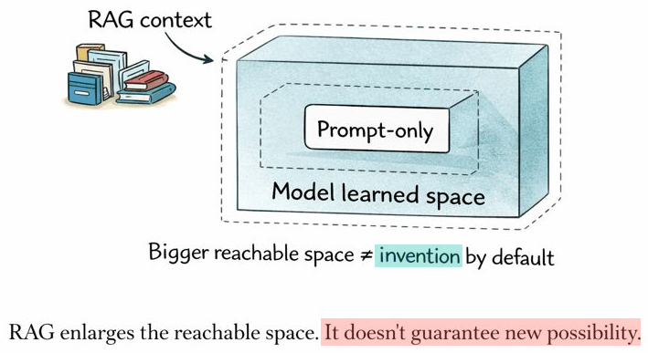 RAG expands the reachable space (what can be answered with the right context). It does not automatically expand the possible space (new primitives, new fundamentals).