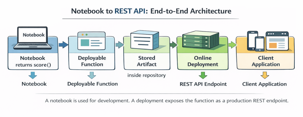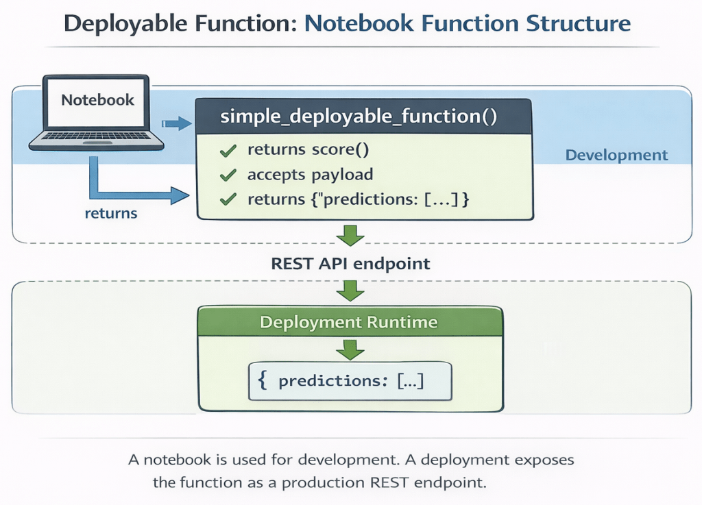 In this cheat sheet, we moved step by step from a local notebook function to a running REST endpoint.