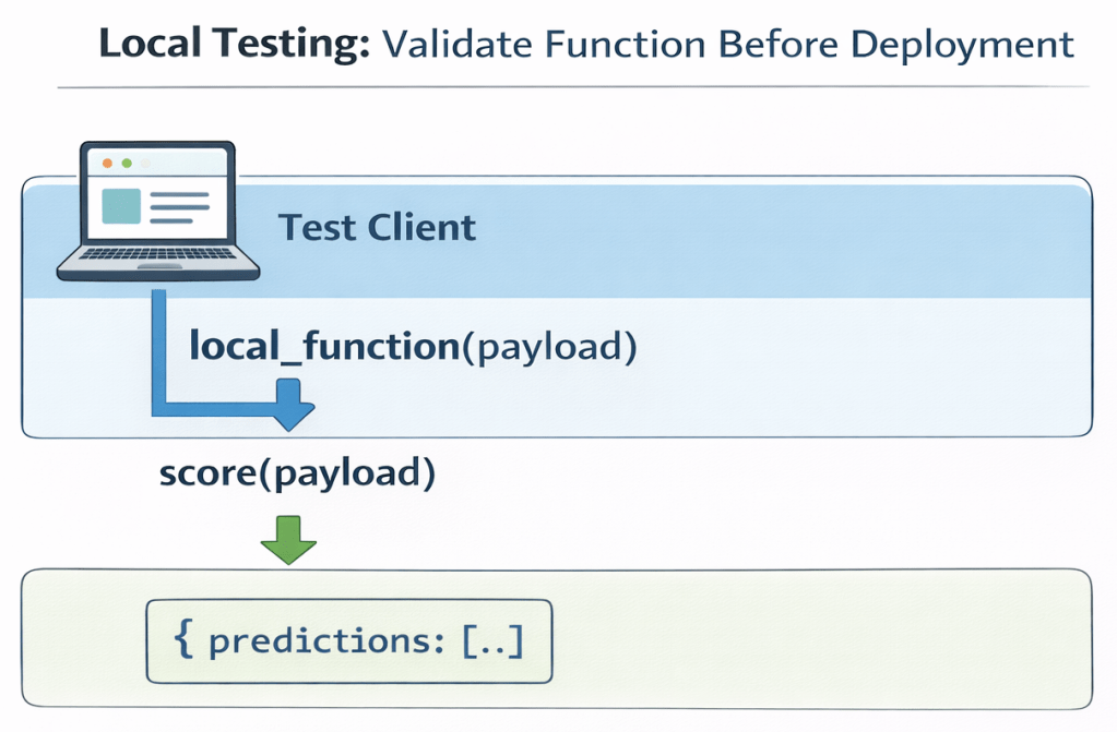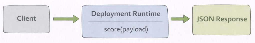 The deployment executes score(payload) and returns a JSON response. The response format matches the structure defined in the deployable function.