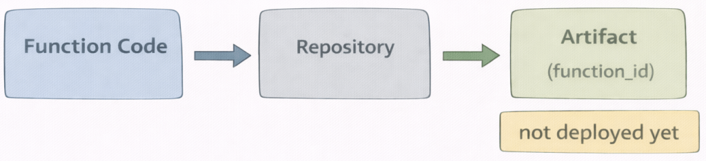 In this step, you store the function in the repository. The function is not deployed yet. It is saved as a versioned artifact.The repository assigns a unique identifier (function_id). This ID is required for creating a deployment. Then you can find the function as a software asset in the deployment space.