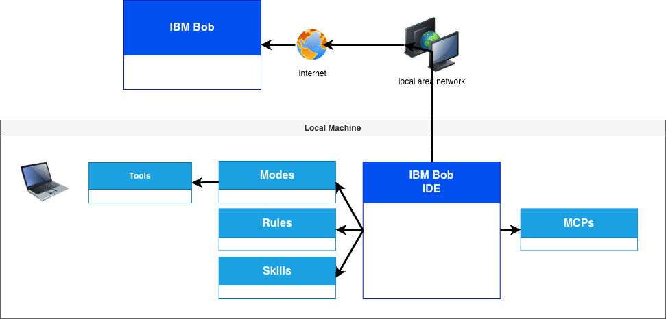 - the main IBM Bob building blocks, such as modes, rules, skills, tools, and MCP connections